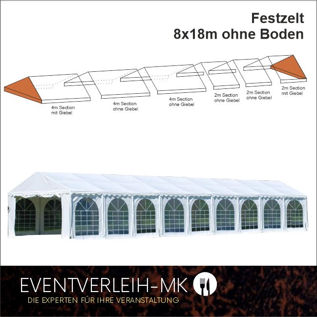Preis bei Verlust oder Beschädigung: 6756,80 € (Netto)Unsere Zelte sind erweiterbar in 2m Schritten.