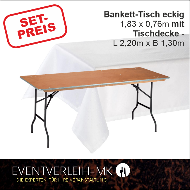 bestehend aus Banketttisch eckig (6503) mit Tischdecke 2,20m x 1,30m (6853) für 6 Personen