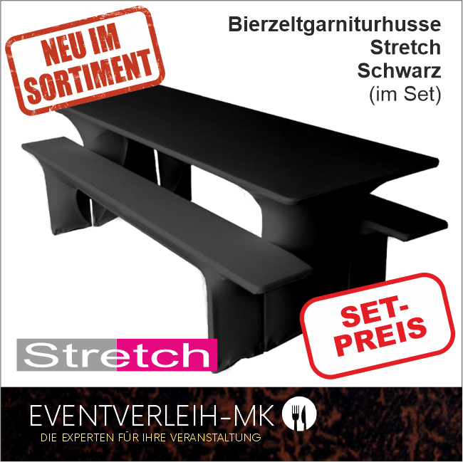 Set Bierzeltgarniturhusse - Stretch (1 Set bestehend aus 1xTisch/ 2x Bank - passend 2,20 x 50cm) schwarz inkl. Reinigung